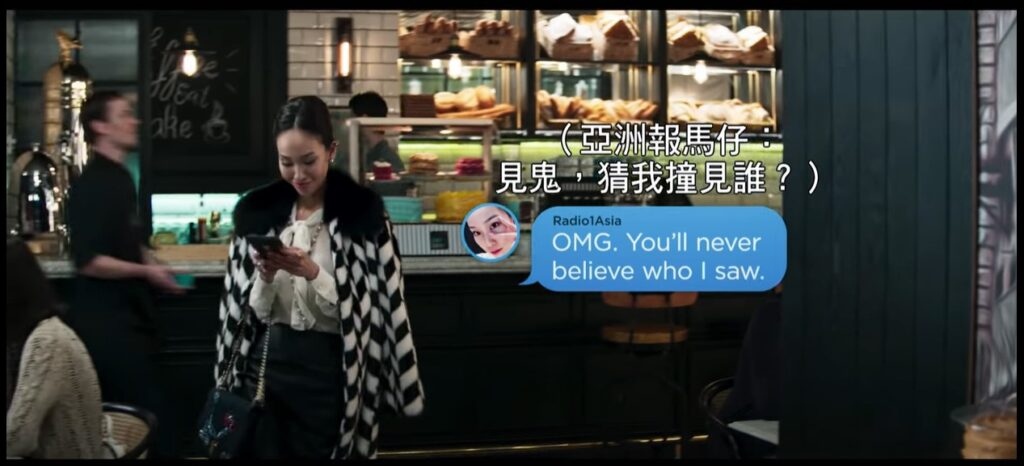 Considering that Crazy Rich Asians was a Hollywood film with Chinese and Southeast Asian / Singaporean references, I am sure there was demand to distribute the films to various markets besides English-speaking ones. I was thus curious to see how this texting sequence was localized, whether the graphics would change.