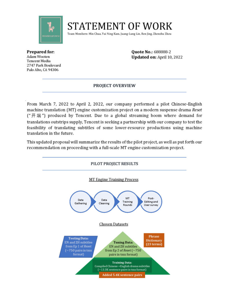 For this project, we were interested to evaluate the feasibility of training a custom MT engine for Tencent Media, which could be used to machine-translate the subtitles for Chinese dramas that the company produces. We first ran a pilot project to evaluate the initial training results and final output quality of the MT engine, before deciding if we would recommend proceeding with a full-scale project.